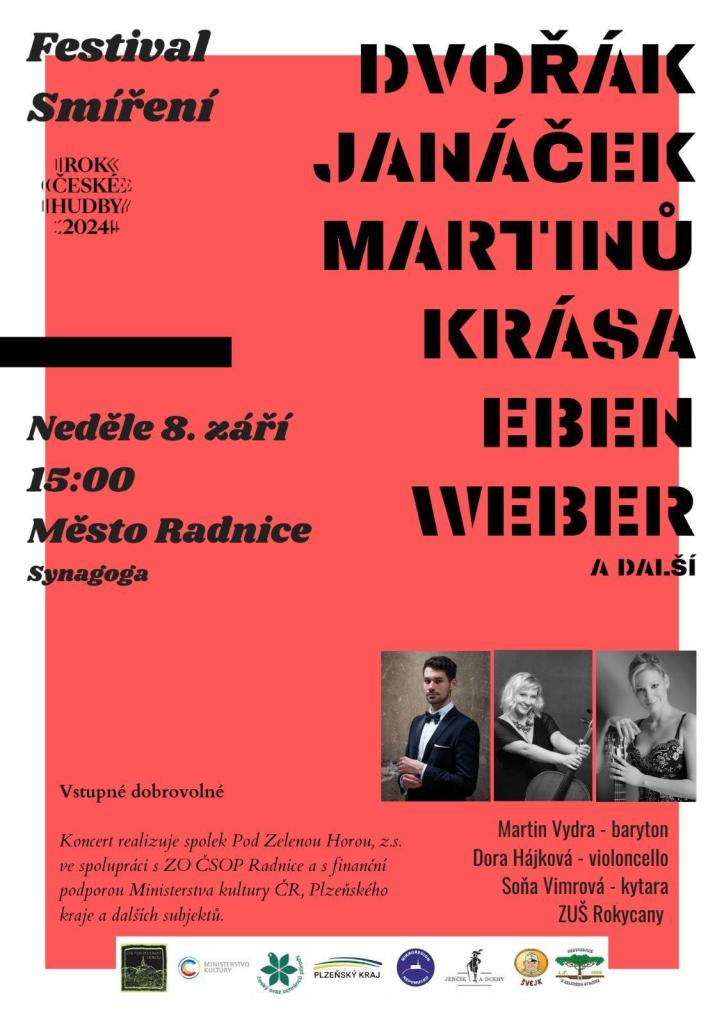 Srdečně vás zveme na jedinečný Festival smíření, který se uskuteční 8. září 2024 od 15:00 hodin v krásném prostředí Radnice. Tento festival, konající se v rámci Roku české hudby, je oslavou hudby a umění, které spojuje lidi a vytváří prostor pro porozumění a dialog.