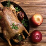 Svatomartinské menu: Předkrm: Kachní paštika na červeném víně, pršut, rybíz, mandle, pečivo 255 Kč